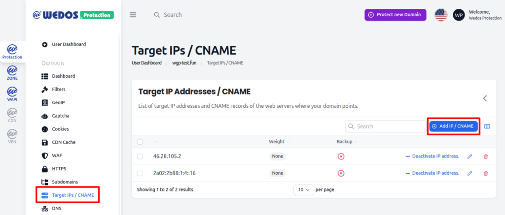 - In the left menu, click Target IPs / CNAME.
